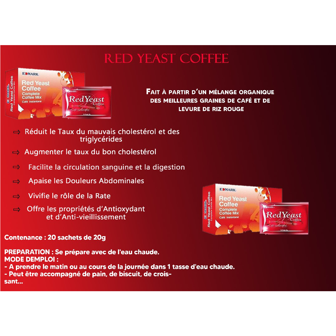 CAFÉ À LEVURE ROUGE – Fabriqué à partir d’un mélange biologique de grains de café importés de première qualité et de levure de riz rouge. Profond et corsé avec une saveur complexe audacieuse et inattendue tout en offrant des bienfaits pour une santé optimale en matière de cholestérol. L’intensité de ce café a une finale vive qui persiste dans vos papilles gustatives. Une tasse ne suffit jamais !